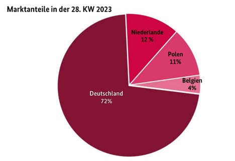 Het hoogtepunt van het Duitse aardbeienseizoen is voorbij. De klanten zijn verzadigd. Bovendien was er minder aanvoer volgens de BLE. Duitse aardbeien voerden de boventoon, maar er was een steeds beperkter aanbod, waardoor de prijzen weer wat stegen. De kwaliteit was ook niet altijd overtuigend.