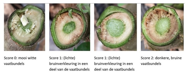 Figuur 3 Gradaties van besmetting met Verticillium in de vaatbundels