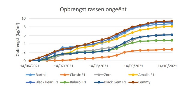 Bij de ongeënte rassen Lemmy, Black Pearl, Bartok en Amalia zag het proefstation de hoogste opbrengsten. Het ras Classis komt heel laat in productie en presteert door heel het jaar ondermaats, dus daar is Stefanie niet tevreden over. In figuur 4 is dat de onderste, oranje lijn. Een conclusie die het proefstation heeft getrokken is dat de mate waarin bladsymptonen van Verticillium worden vastgesteld niet noodzakelijk een goede maatstaf is voor de opbrengst die verwacht kan worden. Er waren bijvoorbeeld planten die er vrij slecht uit zagen wat betreft Verticillium maar die toch voor een goede opbrengst zorgden. Men kan dus de opbrengst niet baseren op hoe ongeënte planten eruit zien.