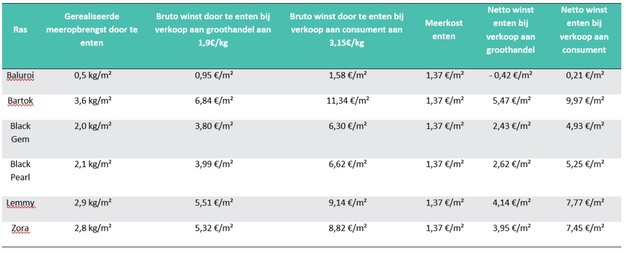 Geënte planten zijn duurder en hebben een meerprijs van €0,60 a €0,80 per plant. In de proef is er gerekend met een plantdichtheid van aubergine van 1,72 planten per vierkante meter. In de proef is er een meeropbrengst, afhankelijk van het ras, door enten van 0.5 - 3,6 kg/m2. Er is gerekend met een verkoopprijs van €1,90 euro per kilo aan de groothandel of rechtstreeks aan de consument van €3,15 euro per kilo. Het proefstation heeft op basis daarvan een tabel gemaakt, figuur 5, met een aantal scenario's.