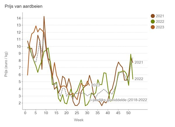 De middenprijs voor aardbei ligt al enkele weken wel ruim boven het gemiddelde van de afgelopen vijf jaar.