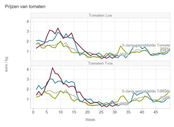Met de afgelopen twee weken matig zomerweer is er ook sprake van matige tomatenprijzen. Bij het VBT kwam de middenprijs voor zowel los als tros niet boven het vijfjarig gemiddelde uit. Sinds eind juni ligt de prijs hier al onder.