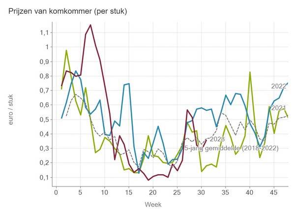 De komkommerprijs bij de veilingen van het Verbond van Belgische Tuinbouwcoöperaties dook in week 29 en 30 ook (weer) onder het vijfjarig gemiddelde. Week 31 liet herstel zien, tot een middenprijs van 36 eurocent per stuk. Nipt ondergemiddeld nog altijd.