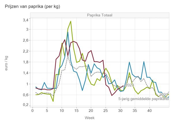 Ondergemiddeld waren ook lange tijd de paprikaprijzen bij het VBT, al steeg de prijs over de hele linie juist vorige week tot net boven het vijfjarig gemiddelde. Dat was voor het eerst sinds week 25. Vooral de prijs van gele paprika's bij het VBT laat een flinke prijsstijging zien.