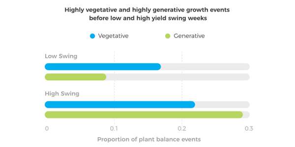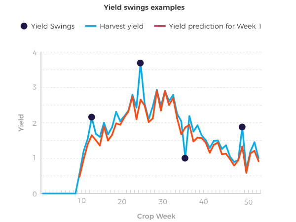 Vervolgens keek het team welke factoren deze opbrengstschommelingen beïnvloedden. Ze keken naar veelvoorkomende patronen in een periode van 8 weken voor het optreden van lage swingweken en analyseerden wat er op dat moment in de teeltomgeving gebeurde.