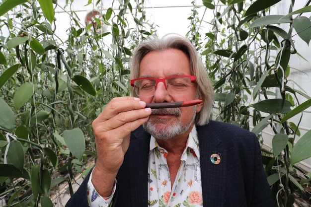 “Maar toen dacht ik: zit een vanillepeul in de natuur echt te wachten tot iemand die groen plukt? Nee toch! Die peul verspreidt namelijk als ze rijp is zo’n intense geur dat ze heel aantrekkelijk wordt om opgegeten te worden door meerdere diersoorten, die vervolgens de zaadjes weer uitscheiden bij de ontlasting. En zo is de voortplanting van de plant verzekerd. Bij een rijpe peul komen immers 22 meer smaken vrij, onder meer een volle umamismaak. Leuk om weten is ook dat het rijpe product bij toevoeging aan melk de drank niet geel, maar roze kleurt. Echte vanillevla is dus niet geel, maar roze! Voor topchefs is dit een geweldige truc om veel meer smaak aan een gerecht te geven.”