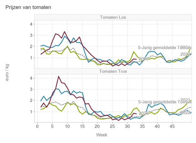 Na een lichte prijsstijging de afgelopen weken voor tomaten, is voor losse tomaten bij het VBT afgelopen week de prijsstijging gestagneerd, terwijl trostomaten een lichte prijsdaling lieten zien. Ruim 81 eurocent per kilo moest er voor een tros betaald worden in week 33. Losse tomaten zijn met 88 eurocent iets duurder.