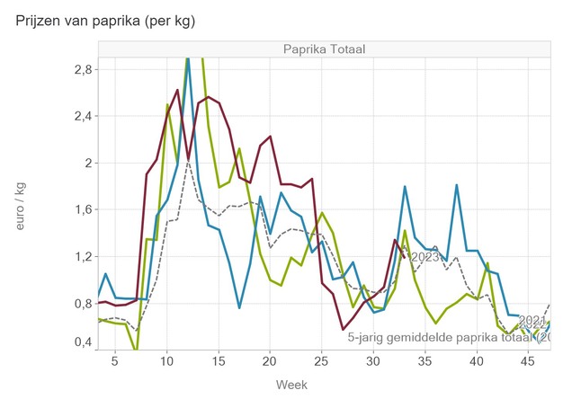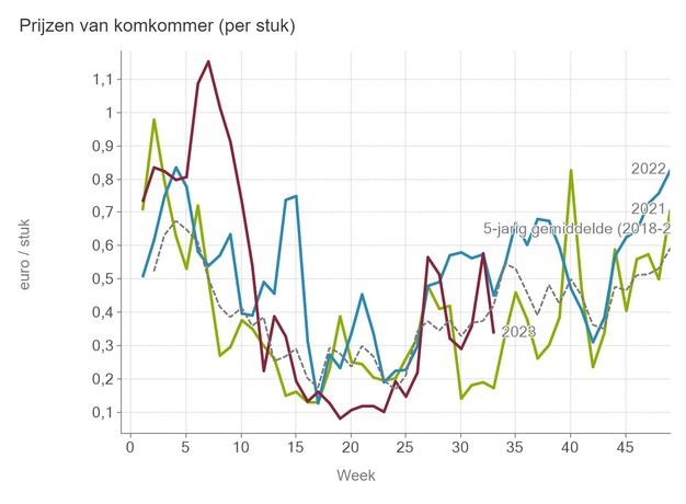 Dat geldt sinds vorige week niet meer voor komkommer. Daar dook de prijs in week 33 met een stuksprijs van gemiddeld 33,8 eurocent onder het vijfjarig gemiddelde. Datzelfde geldt met een middenprijs van ruim 1,18 euro per kilo ook voor paprika, als we alle kleurtjes op een hoop gooien.