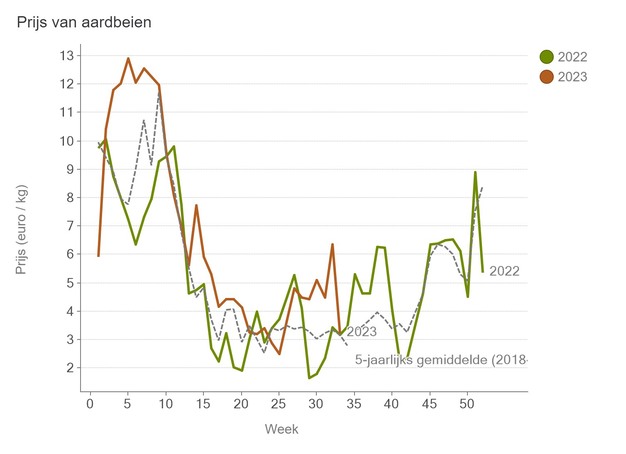 Na wekenlang ruim bovengemiddelde prijzen is, met de start van verse zomerteelten en de herfstteelten in aantocht, de aardbeienprijs bij het VBT weer gezakt tot op het vijfjarig gemiddelde. De volumes lagen de afgelopen periode lager. In week 33 bleef een middenprijs voor alle rassen samen over van 3,24 euro per kilo.