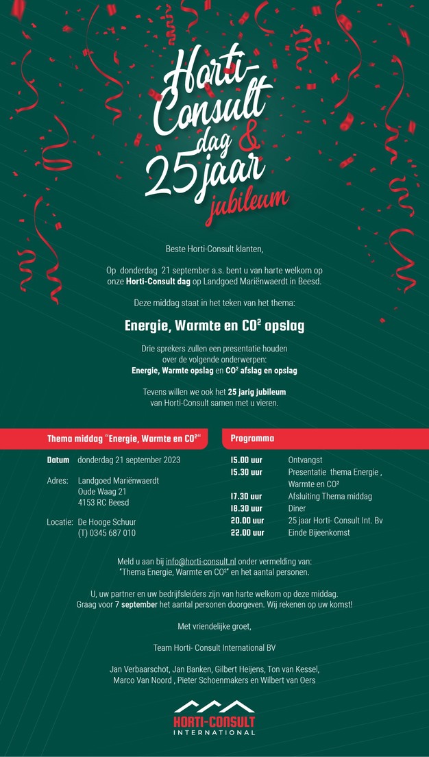 Horti Consult bestaat 25 jaar en dat willen ze dit jaar met klanten vieren op donderdag 21 september 2023. Deze middag staat in het teken van het thema: energie, warmte en CO2-opslag. Drie sprekers zullen een presentatie houden over deze onderwerpen. Aanmelden is mogelijk voor 7 september via [email protected] onder vermelding van "Thema Energie, Warmte en CO2" en het aantal personen.