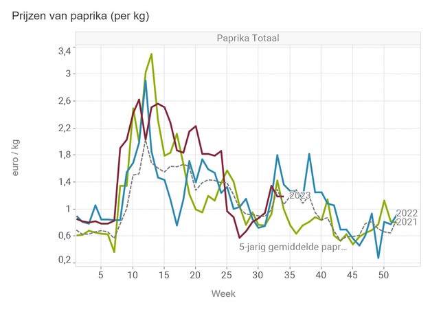Dat geldt ook voor de paprikaprijs. Hier dook de prijs in week 33 even onder het vijfjarig gemiddelde, door het uitblijven van de prijspiek die er de afgelopen jaren nog weleens in week 33 te zien was. In week 34 van dit jaar is een kiloprijs van ruim 1,19 euro gerealiseerd.