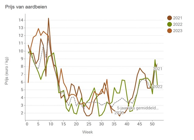 De aardbeienprijs over week 34 komt uit op net iets meer dan 2,01 euro per kilo. Voor het eerst sinds week 25 is de prijs hier weer onder het vijfjarig gemiddelde gezakt. Geruime tijd was er weinig beschikbaar, maar inmiddels zijn de zomerteelten op gang gekomen.