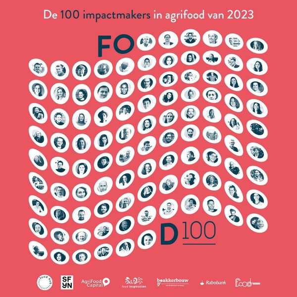 De Food100-lijst van 2023 is hier te bekijken. Food100 is geen ranglijst of wedstrijd, maar een actuele selectie van 100 impactmakers in de agrifood. De lijst is daarom alfabetisch gerangschikt. Alle genomineerden hebben een motivatie aangedragen om hun plek op deze lijst te verdienen en daarmee onderdeel te worden van het Food100-netwerk.