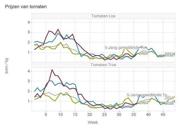 Een kilo losse tomaten is met ruim 88 eurocent zelfs weer iets duurder dan een kilo trostomaten. De middenprijs voor trostomaten ligt al langer boven het vijfjarig gemiddelde en noteert in week 37 84,2 eurocent.