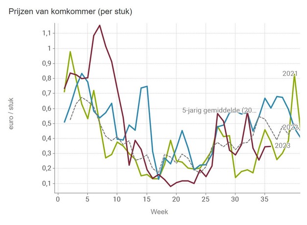 De komkommerprijs heeft het recent weer iets moeilijker. Sinds half augustus is de prijs onder het vijfjarig gemiddelde gezakt. De traditionele prijspiek die er de afgelopen jaren wel te zien was richting eind augustus, bleef uit. De stuksprijs voor komkommer komt in week 37 uit op 35 eurocent. In week 36 was dat 34,6 eurocent.