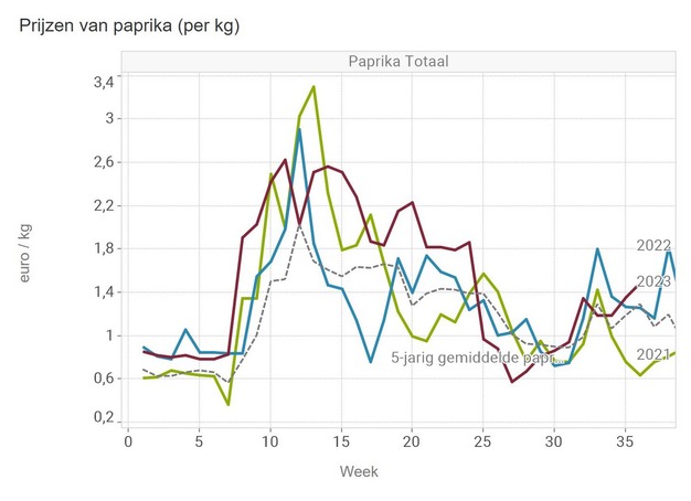 Van de drie 'grote' kleuren in paprika wordt groen het best betaald in week 37 met een middenprijs per kilo van ruim 1,92 euro. Een middenprijs van ruim 1,18 euro voor rode paprika's is lager dan het vijfjarig gemiddelde. Ook eind augustus was dat even het geval, terwijl ook juli een prijstechnisch moeizame maand bleek. Ook de prijs van gele paprika's (1,50 in week 37) ligt onder het vijfjarig gemiddelde.