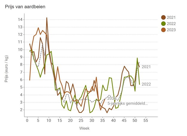 Met 1,88 euro per kilo voor aubergines en 69,5 eurocent per stuk voor kropsla is ook hier sprake van een prijsstijging. Dat laatste geldt ook voor aardbei, waar de middenprijs net boven de 3,50 euro per kilo uitkomt. Elsanta wordt met ruim 3,90 het best betaald. Na een prijsdip in week 34 is de aardbeienprijs aan het opklimmen. Afgelopen week werd nipt het vijfjarig gemiddelde weer geƫvenaard.