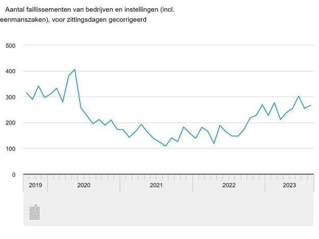 Het aantal voor zittingsdagen gecorrigeerde faillissementen fluctueert aanzienlijk. Dalingen en stijgingen volgen elkaar snel op. Het aantal uitgesproken faillissementen piekte met 911 in mei 2013. Daarna nam het aantal faillissementen tot en met augustus 2017 af. Vervolgens bleef de trend tot medio 2020 redelijk vlak. Daarna is het aantal faillissementen verder afgenomen en bereikte in augustus 2021 met 109 een laagterecord. Vanaf mei 2022 lag het aantal faillissementen onafgebroken hoger dan in dezelfde maand een jaar eerder.