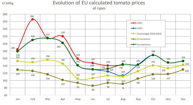 De gemiddelde Europese tomatenprijs is in augustus net als in maart weer tot het niveau van het vijfjarig maximum gezakt. Daarmee ligt de prijs nog altijd hoog, maar is augustus geen recordmaand. Gemiddelde leverde een kilo 1,42 euro op.