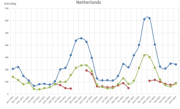 Ook de prijs voor trostomaten (ruim 78%) en losse, ronde tomaten (ruim 65%) ligt in Nederland hoger dan het vijfjarig gemiddelde. In vergelijking met juli is een stijging van de prijzen te zien, zoals die ook al op te merken was aan de belangrijke VBT-referentieprijzen. Met recht kan van een julidip gesproken worden, nu de prijzen weer opgelopen zijn.