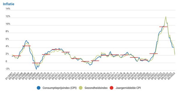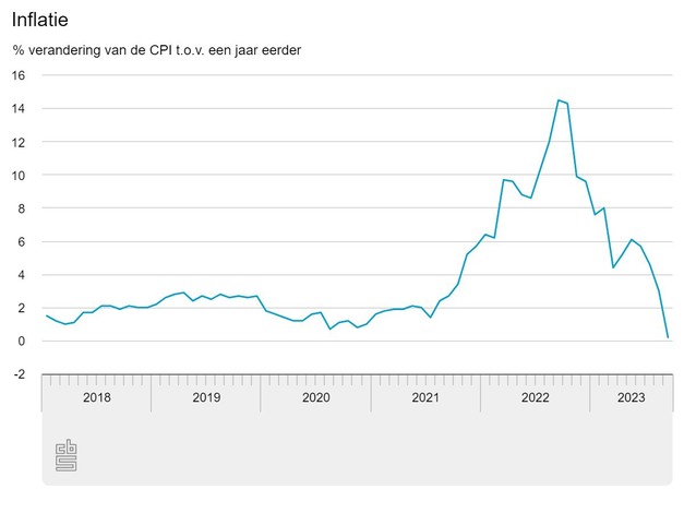 De prijsontwikkeling van energie (gas, elektriciteit en stadsverwarming) heeft al geruime tijd een grote invloed op het verloop van de inflatie. Dit komt met name door de hoge prijzen vorig jaar. In de tweede helft van 2022 namen de energieprijzen in de CPI fors toe. Mede daardoor werd er in die periode een hele hoge inflatie gemeten. De prijzen van energie in de CPI zijn nu een stuk lager dan in 2022. Omdat de inflatie wordt gemeten als de ontwikkeling van de prijzen ten opzichte van dezelfde maand in het voorgaande jaar, valt de inflatie nu lager uit.