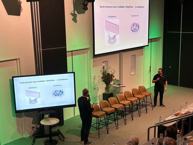 Vervolgens legt zijn collega Dominique Blok uit hoe het ClimaFlow System werkt. Het ClimaFlow System bestaat uit een VentilationJet en een verticale ventilator: de ClimaFlow Fan. Het systeem voert het vocht uit het gewas af, waardoor verdamping wordt gestimuleerd en een actief, homogeen en gezond (micro)klimaat ontstaat. Met ClimaFlow kunnen telers hun klimaatschermen gesloten houden, terwijl ze wel verse lucht van boven het scherm de teeltruimte in kunnen brengen, zo benutten ze alle voordelen van de klimaatschermen en creëren ze het beste klimaat voor het gewas.