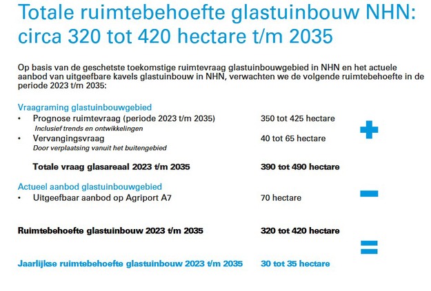 De gemeente Hollands Kroon, waar Agriport onder valt, bespreekt het rapport op 23 oktober. De onderzoekers hebben de groei van het glastuinbouwareaal van de afgelopen 22 jaar geanalyseerd en trekken die lijn door naar 2035. Rekening houdend met ontwikkelingen zoals robotisering en energietransitie komt men op het getal 470 hectare uit. De vraag komt vooral uit de glasgroenten. De vraag naar snijbloemenareaal ziet men afnemen.
