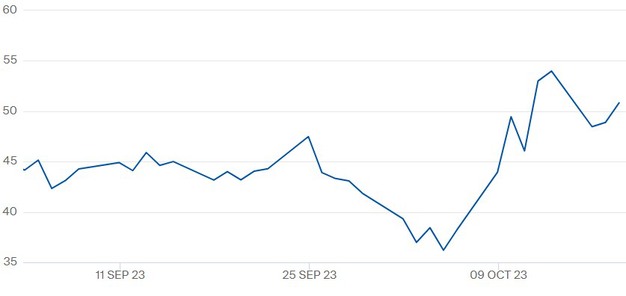 TTF-gasprijs contract 'november 2023' t/m 18 oktober 2023. Klik hier voor vergroting en de meest actuele cijfers.