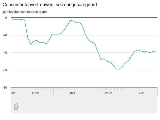 De stemming onder consumenten was in oktober 2023 iets minder negatief dan een maand eerder, meldt het CBS. Het consumentenvertrouwen steeg van -39 in september naar -38 in oktober. Zowel het oordeel over het economische klimaat als de koopbereidheid verbeterde.