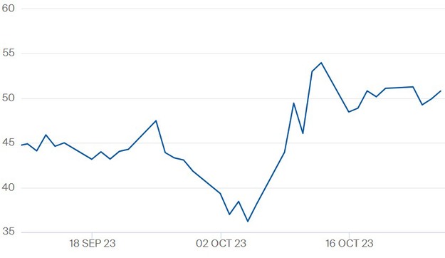 De gasprijs is donderdag weer tot boven de 50 euro gestegen, maar van hevige prijspieken is nog altijd geen sprake, ondanks aanhoudende zorgen over de gevolgen van verdere escalatie van de oorlog tussen Israël en Hamas. Met de verwachte stevige wind dit weekend kunnen de (uur)prijzen voor elektriciteit weer flink weg gaan zakken.