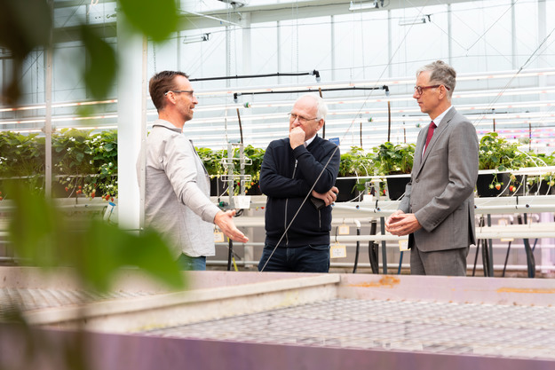 Minister Adema, Peter van der Avoird en Michiel van Ginkel op het werkbezoek van de minister bij Van der Avoird Trayplant.