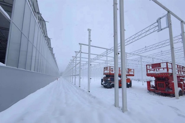 Er is veel sneeuw gevallen in Binnen-Mongolië. Op de bouwplaats van Kingpeng was de sneeuwlaag 11 cm dik. Het bouwen van een kas kan een uitdagende taak zijn tijdens zware sneeuwval. Toch is het met nauwkeurige planning en efficiënte uitvoering mogelijk om zelfs onder ongunstige weersomstandigheden een hoogwaardige glazen kas te bouwen, delen de Chinezen.