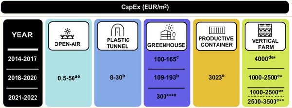 Vertical farms zijn acht tot vijftien keer duurder dan kassen wat betreft kapitaaluitgaven per vierkante meter. Vanaf 2014 tot 2022 hebben telers in open lucht-, plastictunnel- en containers geen positieve ontwikkeling in hun CapEx gezien omdat deze gelijk bleven. Voor telers in de open lucht is dat 0,5-50 euro/m2, terwijl dit voor telers in plastic tunnels 8-30 euro/m2 bleef. Voor teelt in containers is dit door de jaren heen 3023 euro per vierkante meter geweest.