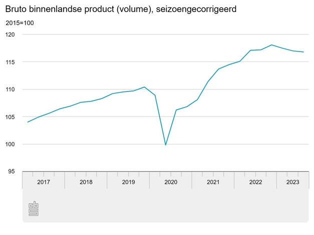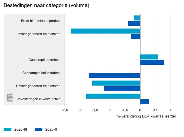 Volgens de eerste berekening van het CBS daalde het volume van het bruto binnenlands product (bbp) in het derde kwartaal van 2023 met 0,2 procent ten opzichte van het voorgaande kwartaal. Dit is het derde opeenvolgende kwartaal met krimp. In het eerste en tweede kwartaal daalde het bbp met respectievelijk 0,5 en 0,4 procent. De krimp in het derde kwartaal is vooral toe te schrijven aan een daling van de investeringen in vaste activa en aan een daling van de voorraadmutatie.