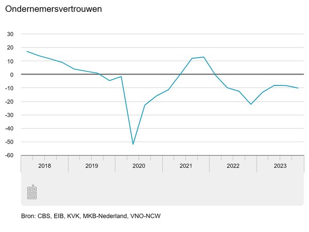 Vanaf eind 2021 tot eind 2022 daalde het ondernemersvertrouwen sterk. In 2023 herstelde het cijfer zich voorzichtig, maar bleef negatief. Aan het begin van het vierde kwartaal van 2023 is de stemmingsindicator toch weer licht gedaald. Het ondernemersvertrouwen ligt onder het gemiddelde van de reeks van -3,9.