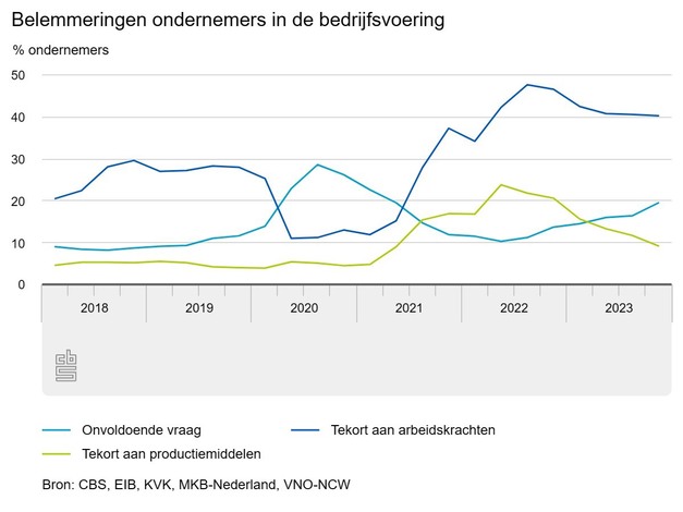 Aan het begin van het vierde kwartaal van 2023 ervaart bijna 20 procent van de ondernemers onvoldoende vraag als voornaamste belemmering in de bedrijfsvoering. In dezelfde periode vorig jaar was dat nog bijna 14 procent. Het aandeel ondernemers die deze belemmering aangeven stijgt voor het zesde kwartaal op rij. Binnen de vervoer en opslag en de industrie zien relatief de meeste ondernemers een tekort aan vraag als voornaamste belemmering. In de bedrijfsvoering worden ondernemers echter nog altijd het meest belemmerd door een tekort aan personeel. Ruim 40 procent van de ondernemers geeft dit aan. Nog maar iets meer dan 9 procent geeft een tekort aan productiemiddelen aan tegen ruim 20 procent een jaar geleden. Ruim 31 procent ervaart geen belemmeringen.