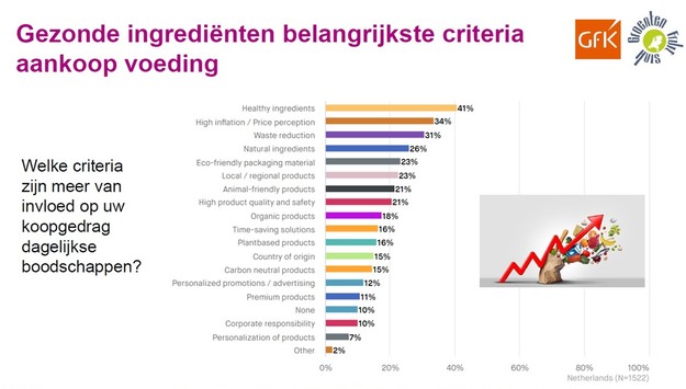 Gevraagd naar koopmotieven van consumenten zijn gezonde ingrediënten met 41% het belangrijkste criterium bij de aankoop van voeding. De hoge inflatie en de prijsperceptie staan met 34% op de tweede plaats. Voedselverspilling scoort met 31% ook fors en daarna scoren natuurlijke ingrediënten (26%), duurzame verpakking (23%) en lokale producten (23%) ook hoog. Dat betekent dat de consument bewuster inkoopt.