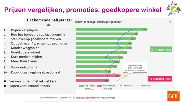 En dat doet de consument toch ook op prijs. Gevraagd naar wat ze het komende half jaar meer gaan doen zijn de top 3 antwoorden: prijzen vergelijken (62%), bonbedrag zo laag mogelijk houden (54%) en overstappen naar goedkopere merken (52%). Opvallend is ook dat het kopen van lokaal, regionaal, nationaal belangrijk is voor 31% van consumenten. Dat percentage is, na een forse dip in de herfst 2022 weer toegenomen en ligt boven de meting die in de lente van 2022 werd uitgevoerd. Koopmotivaties zoals ‘mezelf verwennen’ of ‘iets voor iemand anders kopen’ is afgenomen ten opzicht van de herfst van 2022, maar ligt (fors) boven het niveau van de meting in de lente van 2022.