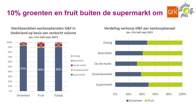 Supermarkten blijven het belangrijkste aankoopkanaal, 90% wordt daar verkocht. De overige 10% gaat via groentewinkels (2%), op de markt (4%) bij boeren/telers (2%) en overige kanalen (2%). Voor het gespecialiseerde kanaal zijn vooral fruitaankopen belangrijk. Positief is dat vergeleken met 2019, het jaar voor de coronapandemie, het aankoopniveau van groenten 9% hoger is, fruit is gelijk gebleven.
