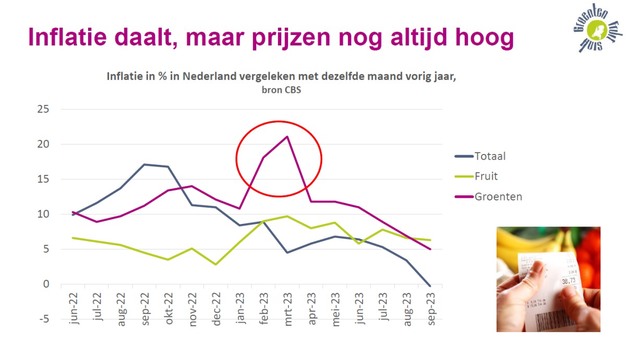 De inflatie laat een dalende trend zien, maar de prijzen van groenten en fruit zijn nog altijd hoog. "Dat ligt niet alleen aan de inflatie, maar vooral ook aan de beschikbaarheid", zei Wilco. In februari en maart van dit jaar piekten daarom de prijzen voor groenten.