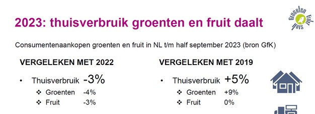 Uit berekeningen van GroentenFruit Huis bleek al dat de consumptiegroei van groenten en fruit, ingezet in het coronajaar een terugval liet zien. In 2023 zet deze trend door. Uit cijfers tot en met september 2023 blijkt dat, vergeleken met 2022, het thuisverbruik van groenten met 4% is gedaald en van fruit met 3%. "Die consumptiecijfers liggen voor groenten nog wel flink hoger (9%) dan in het pre-coronajaar 2019", zo vertelde Wilco. Voor fruit zijn de consumentenaankopen in 2023 gelijk aan die van 2019.