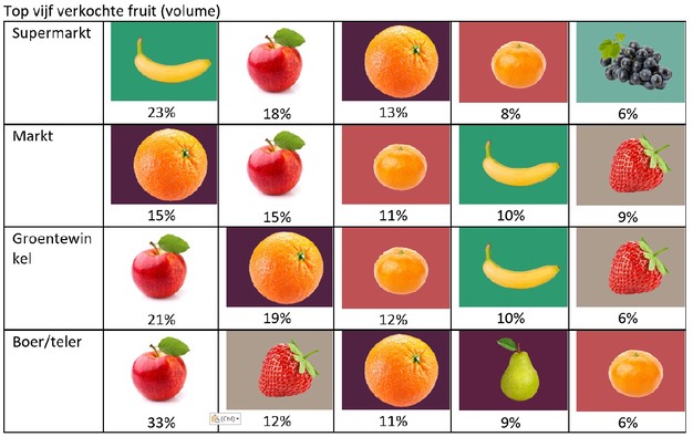 Tomaten, komkommers, bloemkool, uien, bananen, sinaasappelen, appelen en mandarijnen zijn de meest populaire producten, maar waar en in welke mate deze gekocht worden, verschilt per verkoopkanaal. Opvallend is dat aardbeien en asperges vooral in het gespecialiseerde kanaal worden verkocht en dat in de groentewinkel steeds minder losse groenten en fruit worden verkocht en meer
