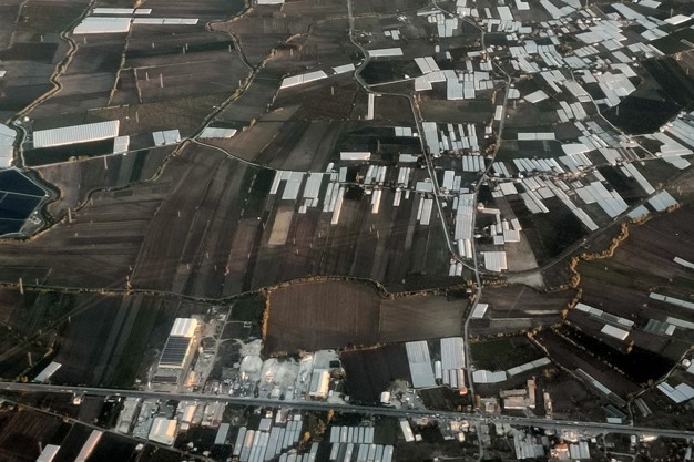 Overal waar je kijkt veelal kleine plastic foliekassen, hier gezien vanuit het vliegtuig