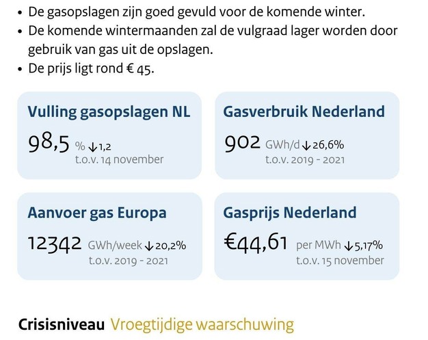 Met de Nederlandse gasvoorraad zit het voorlopig wel snor, zo leert een update van het ministerie van EZK van 24 november.