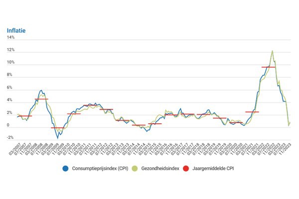 De prijsontwikkeling van energie (gas, elektriciteit en stadsverwarming) heeft al geruime tijd een grote invloed op het verloop van de inflatie. Dit komt met name door de hoge prijzen vorig jaar. In de tweede helft van 2022 namen de energieprijzen in de CPI fors toe, met een piek in oktober 2022. Mede daardoor werd er in die periode een hele hoge inflatie gemeten. De prijzen van energie in de CPI zijn nu een stuk lager dan in 2022. Omdat de inflatie wordt gemeten als de ontwikkeling van de prijzen ten opzichte van dezelfde maand in het voorgaande jaar, valt de inflatie nu lager uit.