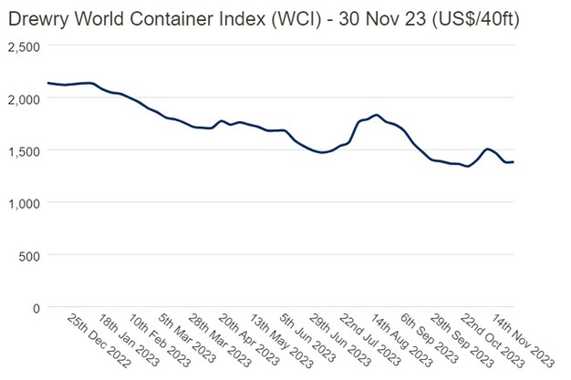 De samengestelde index bleef stabiel en is met 40% gedaald in vergelijking met dezelfde week vorig jaar. De meest recente samengestelde index van Drewry WCI van $1.382 per 40-voet container is nu 3% lager dan de gemiddelde tarieven van 2019 (pre-pandemie) van $1.420.