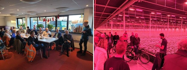 Op de fiets door de kassen van Kwekerij Gitzels vertelde Mike Gitzels over de verduurzamingsstappen die het bedrijf inmiddels heeft genomen en wat er nodig is voor de volgende stappen. Een belangrijk onderdeel wordt betaalbare groene elektriciteit in de winter. Via de Nieuwe Dijk volgde de fietstocht naar de buren: Fred van Paassen Chrysanten, waar Jan van Paassen op enthousiaste wijze de raadsleden vertelde over de chrysantenteelt met Led-verlichting, luchtontvochtiging en biologische bestrijding. Jacco Vooijs: "Het was een zeer boeiend werkbezoek waarbij de interesse voor de stappen die de glastuinbouw in Het Grootslag gemaakt heeft zeer groot was, dat bleek uit de vele verdiepende vragen van de raadsleden."