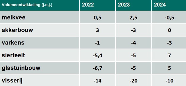 De bank doet voor alle agrarische subsectoren een prognose van de volumegroei van 2023 en 2024. In zijn algemeenheid concludeert de bank dat veel agrarische bedrijven in 2023 een goed jaar gehad door lagere kosten en gestegen prijzen in vergelijking met vorig jaar.