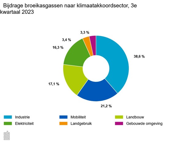 De Nederlandse uitstoot van broeikasgassen lag 9 procent lager in het derde kwartaal van 2023 in vergelijking met hetzelfde kwartaal in 2022. Daarop wijst het CBS. De uitstoot van broeikasgassen door de landbouw was in het derde kwartaal 6 procent hoger. Dit komt doordat tuinders meer gebruik hebben gemaakt van hun warmtekrachtinstallaties (wkk) op basis van aardgas. De statistici vermoeden een verband met de gedaalde aardgasprijzen.