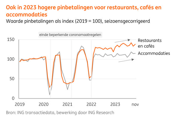 Na de grote post-Covid inhaalslag in 2022 en begin 2023, keerde de horeca in het tweede kwartaal van 2023 terug naar een stabieler groeipad. Uit de meest recente ING transactiedata blijkt dat de waarde van de pinbetalingen in 2023 (t/m november) voor restaurants en cafés 13% en voor accommodaties 7% hoger waren ten opzichte van dezelfde periode in 2022. Dit is aanzienlijk, al geven deze cijfers wel een enigszins vertekend beeld. De hoge groei komt enerzijds door prijsverhogingen, van gemiddeld 9%, die de horeca dit jaar heeft doorgevoerd. Anderzijds betreft de groei nog deels herstel van de coronapandemie in het eerste kwartaal 2023, aangezien de horeca in Nederland in de eerste twee maanden van 2022 nog met beperkingen te maken had.